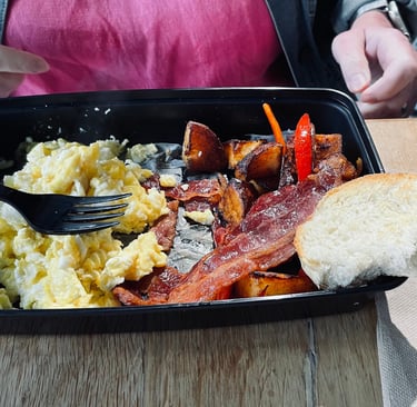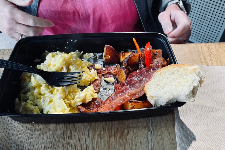 Unser abendlicher Versuch für das Frühstück einzukaufen, war nicht so von grossen Erfolg gekrönt, also suchten wir morgens ein Cafe. Wir meinten ein kleines Frühstück mit zwei Rührereiern zu kommen. Aber wenn zwei Nationen meinen das Gleiche zu machen, ist es noch lange nicht das Selbe.